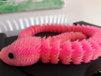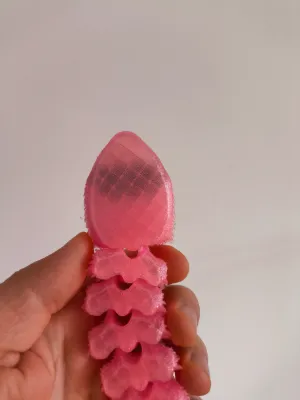 Cena rewelacyjna – świetny stosunek jakości do ceny. Drukowałem z filamentu wężyk długości około 80 cm i od dołu widać, że materiał jest lekko przezroczysty, natomiast w małych detalach praktycznie tego nie widać. Filament drukuje się bardzo dobrze, bez litek, problemów z nitkowaniem czy innych komplikacji. Stabilny i przewidywalny materiał do różnych projektów. Drukowałem ten model od początku szpuli, mam wrażenie, że więcej jest koloru różowego niż tego drugiego. Filament mocny, raz stanąłem na węża z kolcami nic mu nie było xD